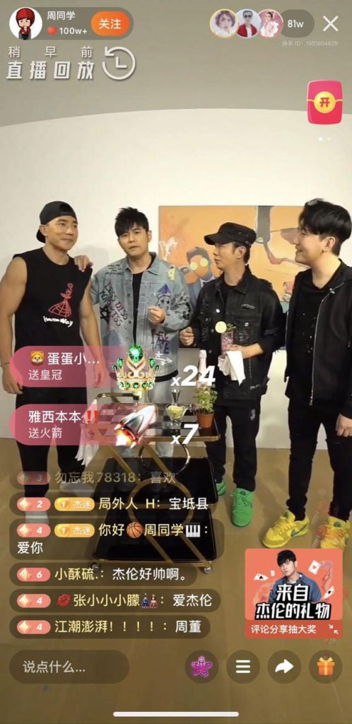 Famous pop star Jay Chou (second left) live streaming on Kuaishou