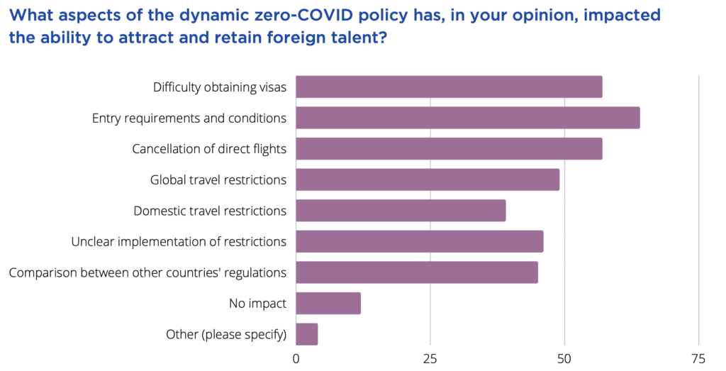 However, 33% of respondents indicated they were not satisfied with the management of Covid-19. Comments from respondents also report a sense of exhaustion with travel restrictions, exasperation with the scale of disruptions, and concerns over the continued shrinkage of the foreign talent pool within China.