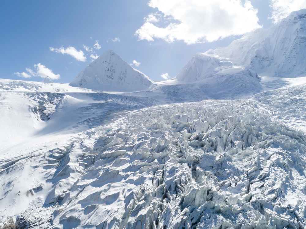 China’s glaciers are mostly to be found on the Qinghai-Tibet Plateau. By their seasonal melt, they feed rivers including the Yangtze, Yellow, and Yarlung Tsangpo (which flows on to become the Brahmaputra). Surveys show that between the 1970s and 2010, a fifth of China’s total glacial area melted permanently, meaning 12,442 square kilometres of glacier loss.