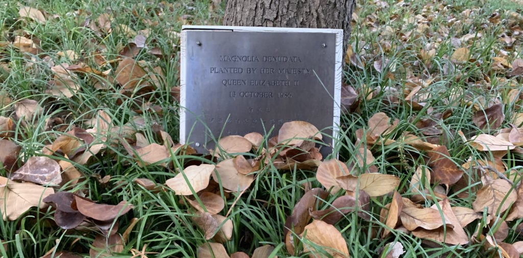A plaque marking the magnolia tree planted in the grounds of the British Embassy by the queen during her visit to China in 1986