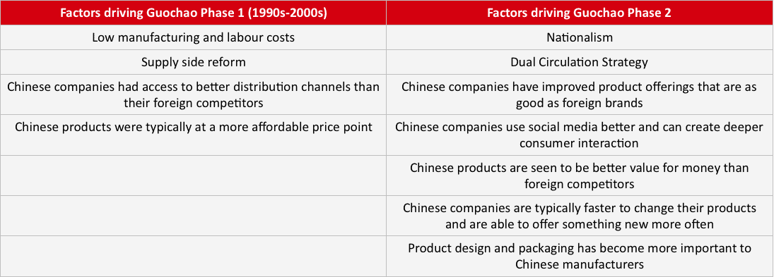The sectors most susceptible to guochao are those in which China developed manufacturing capability during the late 1990s and early 2000s. Chinese companies successfully managed to reverse engineer products that they used to manufacture cheaply for foreign brands 20 years ago and are now launching their own versions that are often more innovative than the originals.