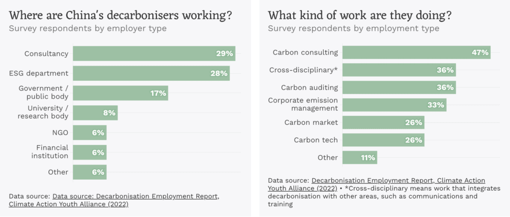 The report splits decarbonisation employment into four main fields: emissions management, emissions auditing, carbon trading, and carbon neutrality tech. Jobs are found in a range of sectors, including energy, industry, buildings, transportation and finance. The biggest employer among these is emissions management consulting, followed by emissions auditing. Most of the 121 survey respondents were working in consultancies or the ESG/sustainability department of companies that outsource their environmental reporting. Zhi Hanzhen also explained that other services are being developed, such as carbon-neutrality communications and training.