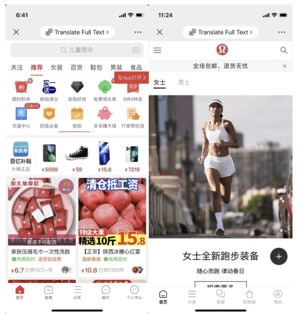Mobile websites for Pinduoduo and Lululemon, usually accessed via a link from a brand’s official WeChat account