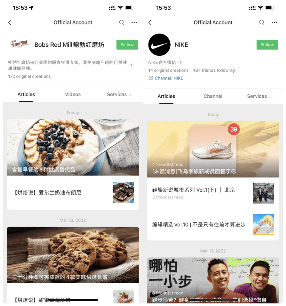 The official WeChat Accounts of food brand Bob’s Red Mill and Nike