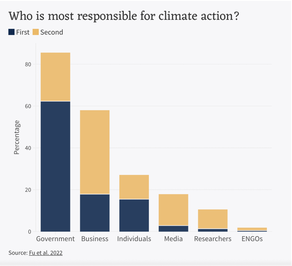 Despite the fact that climate change figures in the reproductive concerns of many, very few respondents believed that having fewer or no children is effective in tackling climate change. The majority believed that, compared with actions on an individual level, those of countries and corporations have a greater impact on climate, and thus they should be bearing responsibility for tackling climate change. As stated by a 22-year-old university student: “For a child born into a moderate family, the environmental burden of childrearing is negligible when compared with big business or macro policies.” When asked who should bear the greatest responsibility for addressing climate change, over 60% of respondents ranked “government” first, and over 40% ranked “business” second. Only 15% and 12% ranked “individuals” first and second respectively.